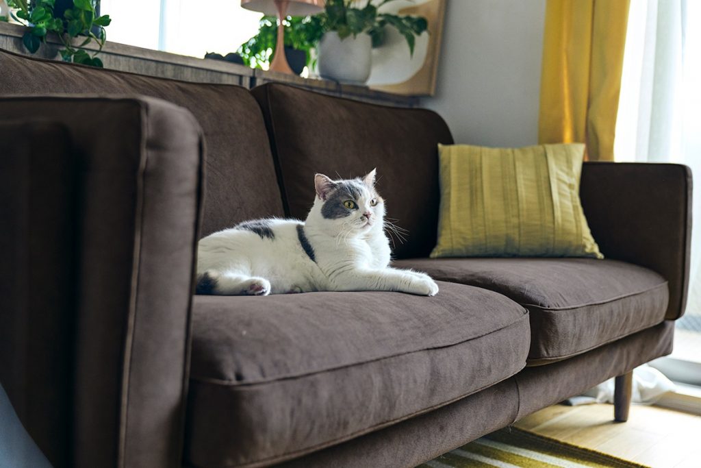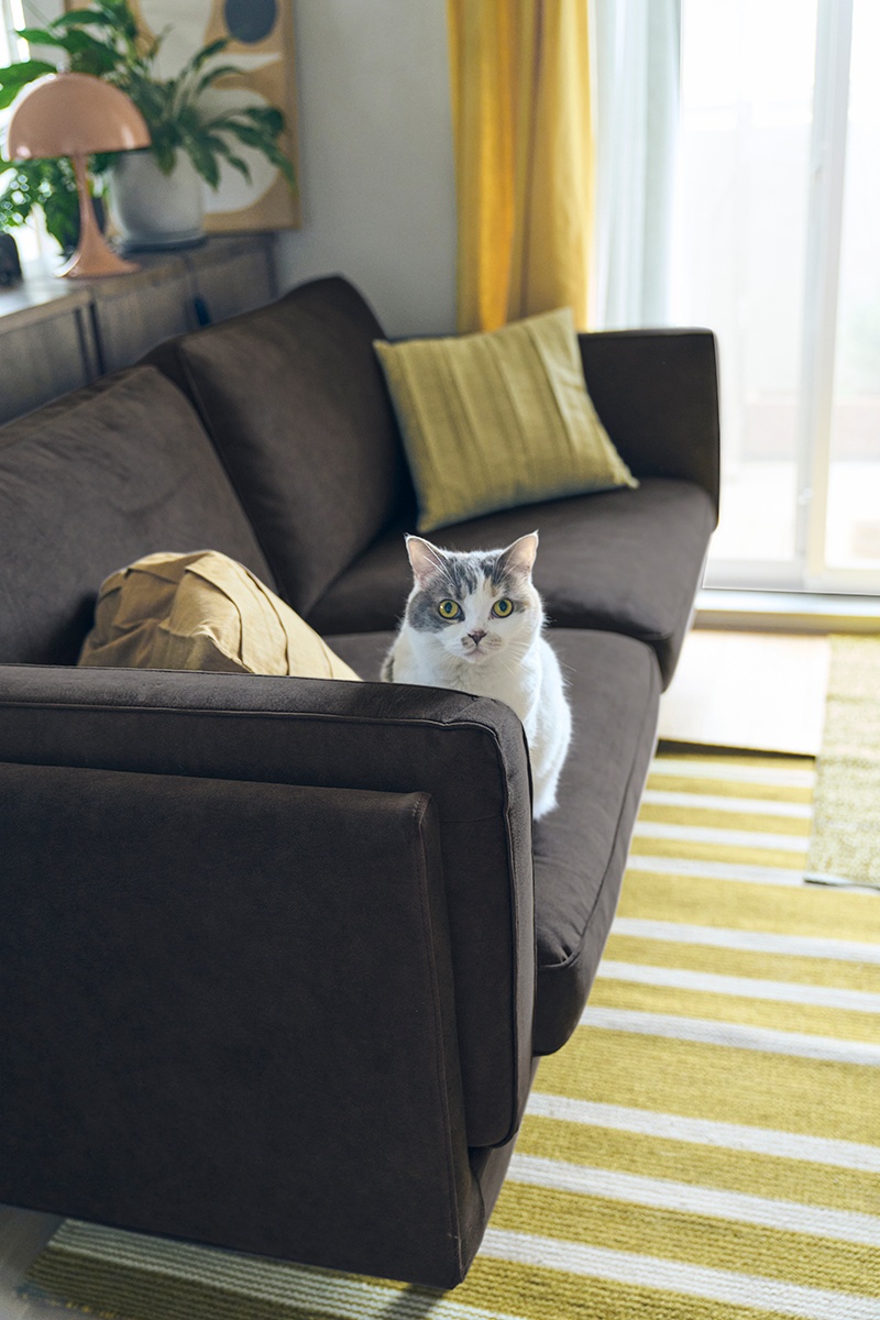 広々とした座面で、のんびりくつろげるDUBBEL(デュベル)。背もたれやアームが平らなので、ネコが飛び乗ってくつろぐ場所にもなりますよ。